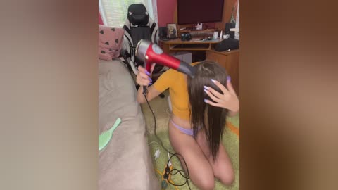 Video of a young woman with long brown hair, wearing a tight orange top and white thong, standing in a cluttered, dimly lit bedroom with hanging clothes and a messy desk.